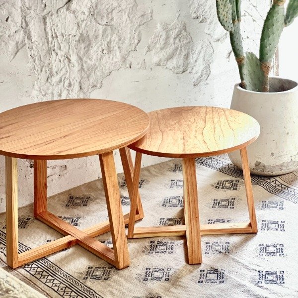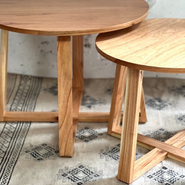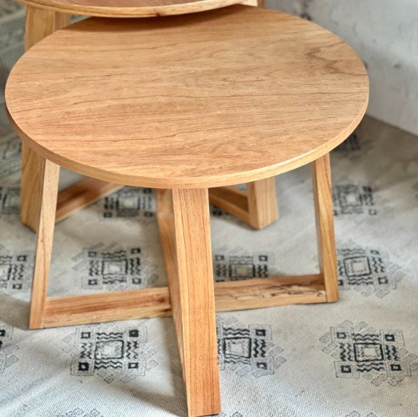 Duo de mesas en Paraíso, laqueadas con terminación bien natural.